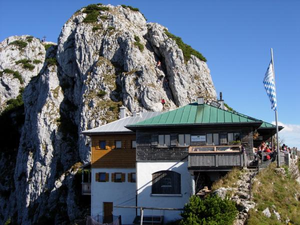Informationen: | Oft besuchter Gipfel, "Zwilling" des Roßstein. In netter Kletterei (I, Stelle II) in 15 Minuten von der Tegernseer Hütte zu erreichen. Zahlreiche Kletterrouten. | ||