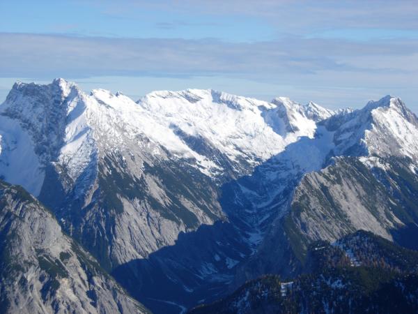 Die Grubenkarspitze (Mitte) vom Hohen Gleirsch aus gesehen. Ganz links die beiden Sonnenspitzen, dazwischen Laliderer Wand und Dreizinkenspitze. Etwas rechts unterhalb die Roßlochspitze. Am rechten Kamm Reps, Sunntiger, Hallerangerspitzen, Gamskarspitze, Brantlspitze und Hochkanzel.