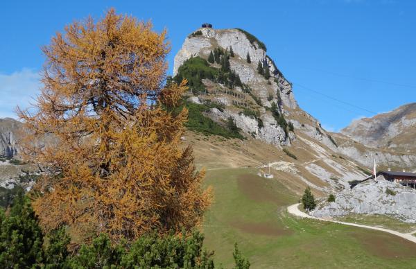 Informationen: | Ab Erfurter Hütte bzw. Rofanbahn Bergstation auf gut beschildertem Weg; kurze seilgesicherte Stelle (für Turnschuhtouristen); ca. 45' | ||