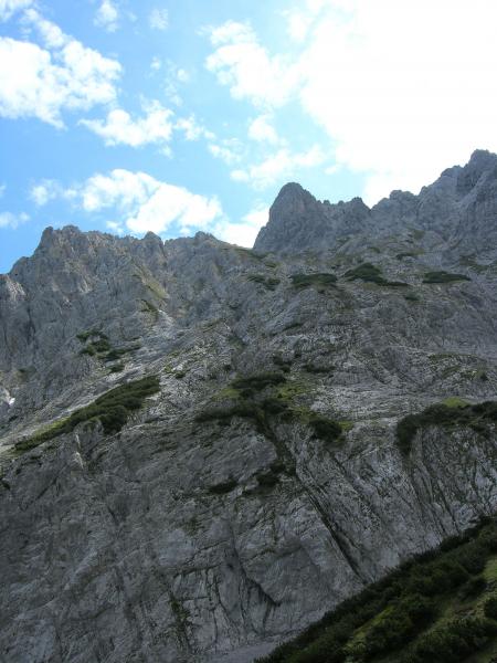 Hübsches Schrofengelände für den Anstieg zu Totenfalk. Der "Gipfel" in der Mitte des Bildes ist nur ein kleiner Felskopf im Verbindungsgrat zwischen Totenfalk und Turmfalk.