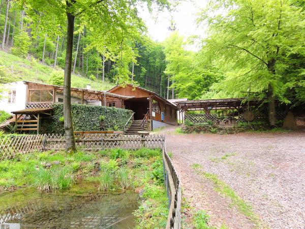 Dieses nordwestlich von Eußerthal aufgenommene Foto zeigt die Hütte mit ihrer nach Süden ausgerichteten Eingangstreppe im Mai 2010.